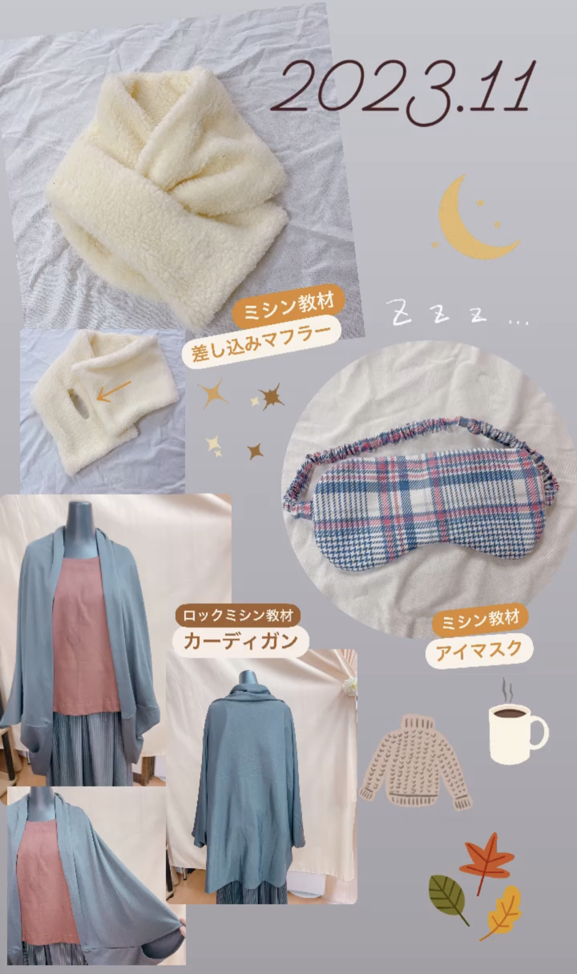ミシンの教材は、アイマスクと差し込みマフラー。